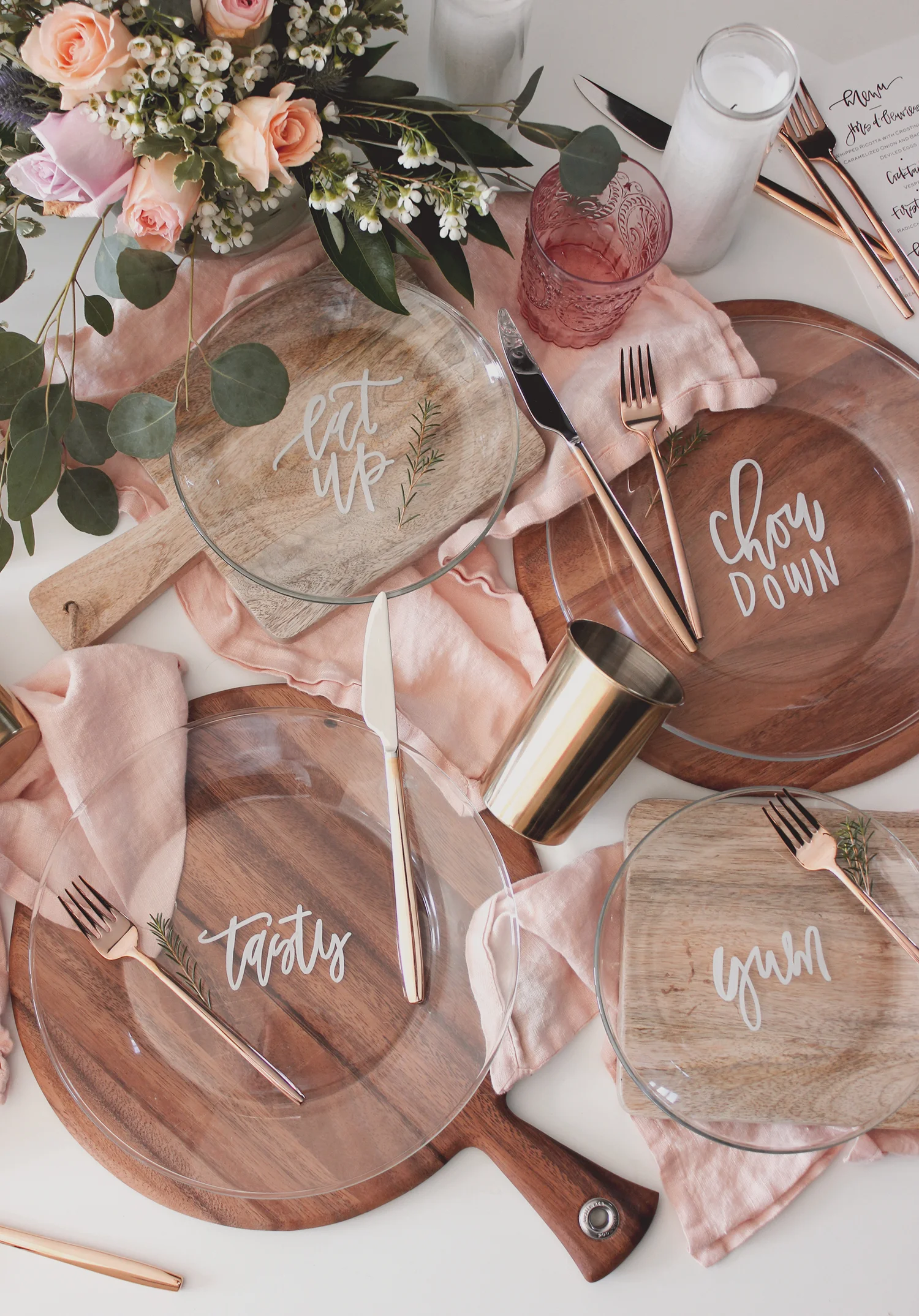 We've hit daylight saving time (I heard on the radio it's daylight saving, not savingS, is that true or were they trying to trick me?) and are just a few days away from spring, so all that's been on my mind is setting the table for some simple outdoor entertaining. And we can have that without a little calligraphy to spruce the table up right? ;)