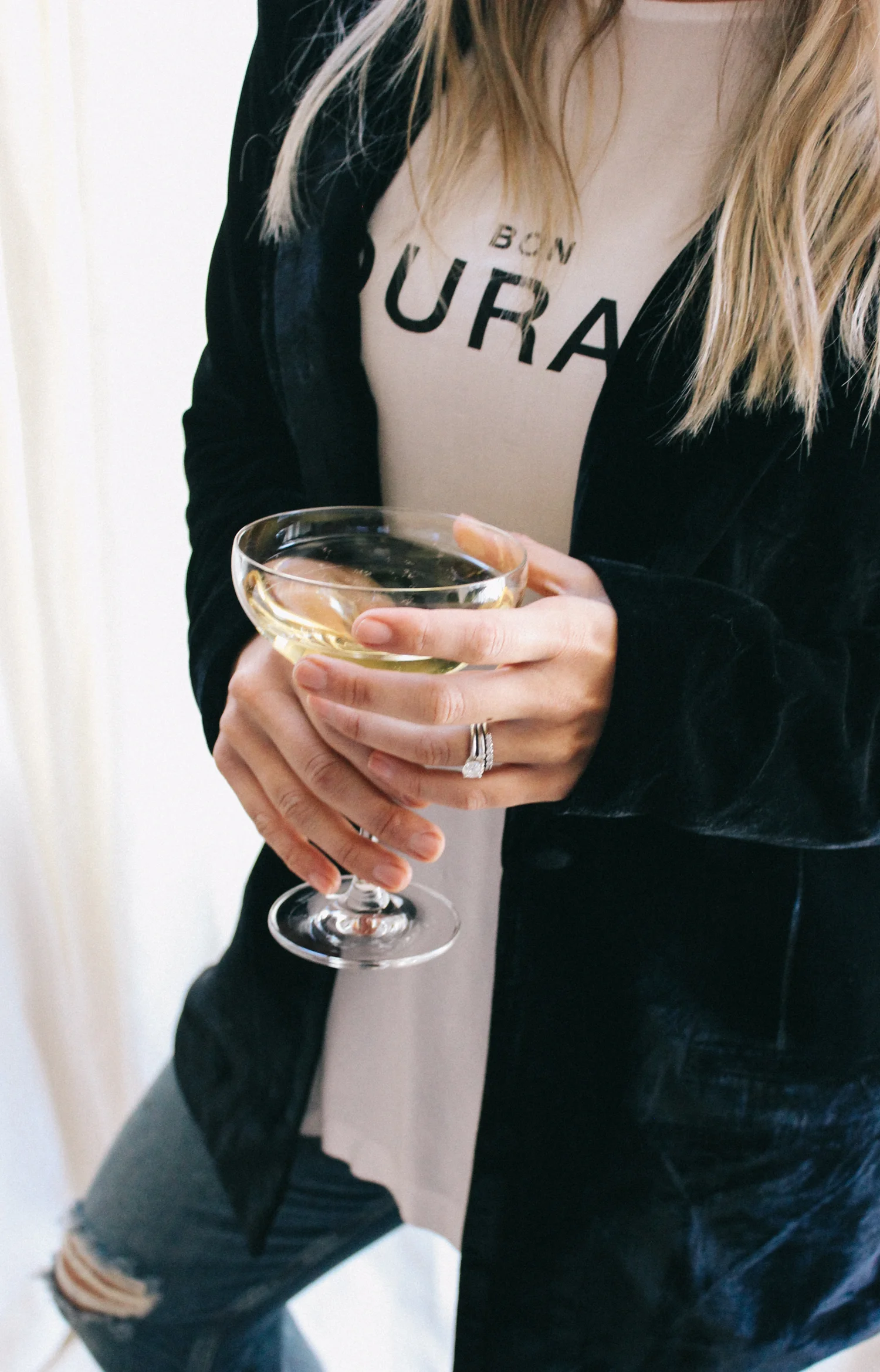So, I've been planning slowly, what to pack... and as mentioned in my post earlier this week, how to make things work for more than just one night out. I started playing around with this velvet blazer, you know figuring out how to make it work from day time, to happy hour, to a weekend trip. Paired with a tee, red lips and my FAVORITE (like, I literally wear it every other day... and am wearing it as I type) hat, I felt like this would make the perfect friday work to happy hour look. Just add champagne;)