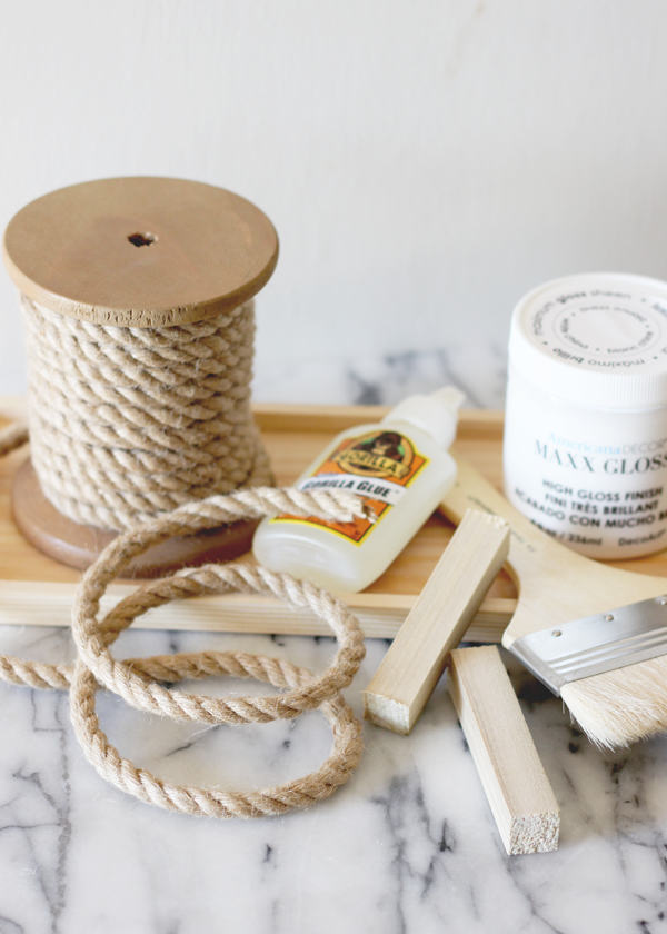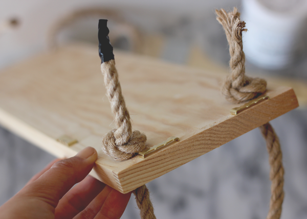 use the gorilla glue to glue down the "feet" of the tray as well as secure the knots so the don't unravel or slip down. you will need to add the feet since once you tie the knots in the rope, the tray will not sit flat… any piece of wood will work here as long as its thicker than your knot, but smaller than the width of the tray.