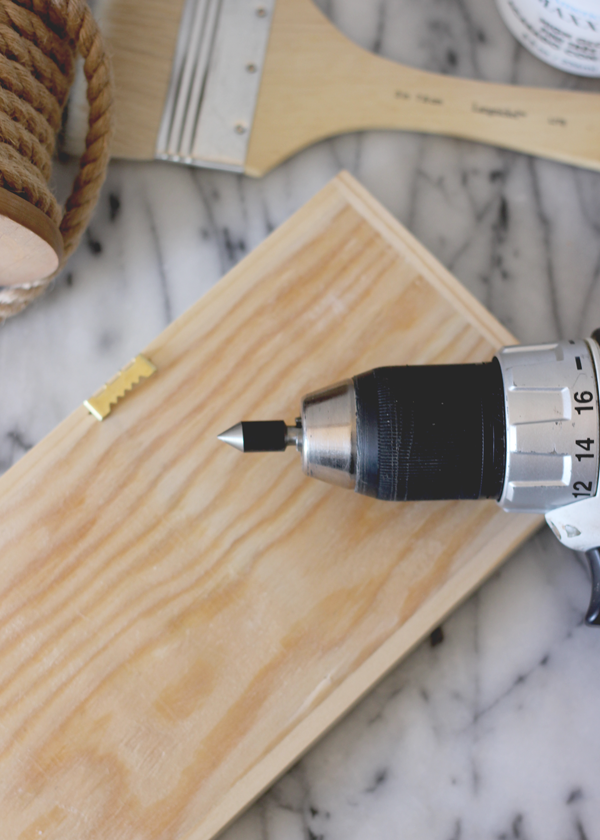 i found this plank with a small frame at michaels (i think it was meant to hang on a wall as a sign, it had all the hooks on the back, no biggie to leave them), rope, white paint, gorilla glue, two small wood pieces to use as feet, and a drill.